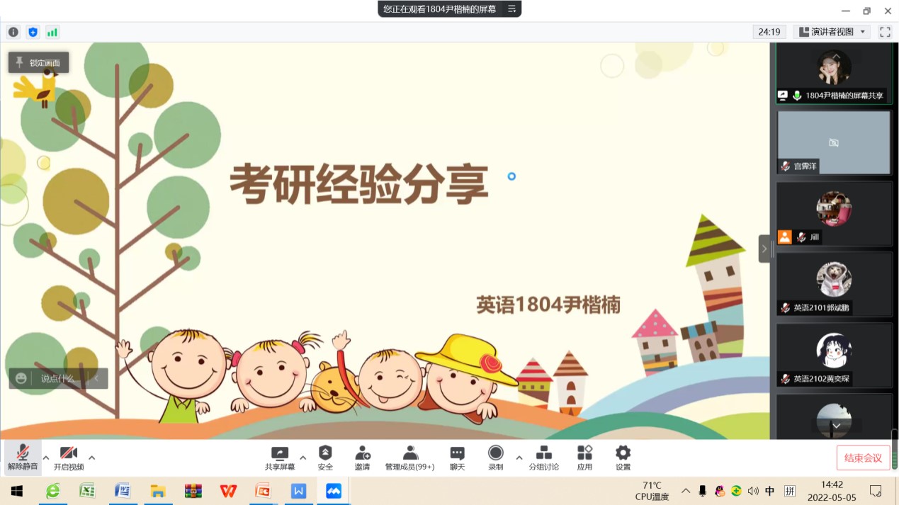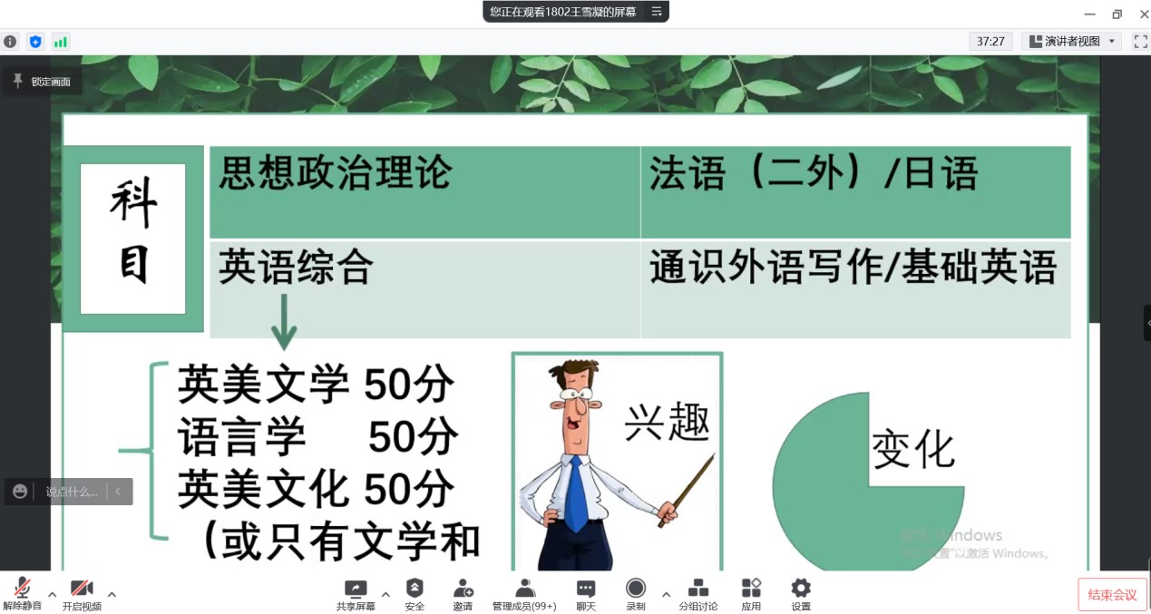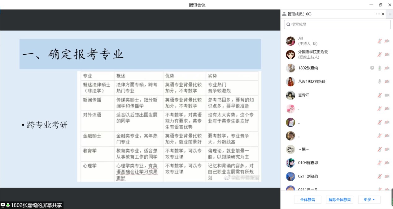 2022年5月5日下午,bevictor韦德国际英语专业通过腾讯会议召开了考研暨就业交流会。会议由教学部主任王静老师主持,邀请2018级9位成功考取硕士研究生以及顺利就业的员工交流心得和分享经验,2019级、2020级以及2021级170余名员工与会交流。学长从选择考研公司和专业、复习备考、调剂公司、就业和备考教资五个方面分享了自己的经验,并鼓励学弟学妹们平时注重知识积累和能力培养。