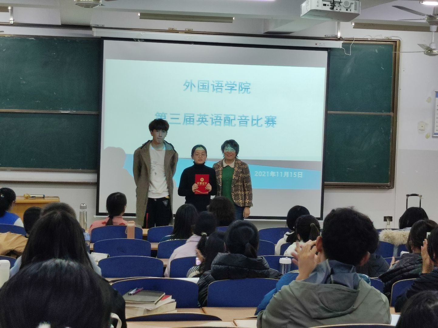 比赛开始前,员工会工作人员提前布置场地,进行多媒体设备的调试,并引导各位评委老师、比赛选手和观众有序入场。比赛开始时,由主持人宣布比赛规则及流程,各组参赛选手有序上台进行比赛,各组配音展示后由评委老师对小组表现进行点评,提出相关建议并进行打分,并由工作人员核算各组得分。经过一下午的视听盛宴,最终由主持人宣布比赛结果:《爱丽丝梦游仙境》组杨紫坤等人,《疯狂动物城》组刘明轩等人荣获一等奖,《寻梦环游记》《功夫熊猫》等组荣获二等奖,《疯狂动物城》《飞屋环游记》《灰姑娘》等组荣获三等奖,评委为获奖小组颁发荣誉证书。