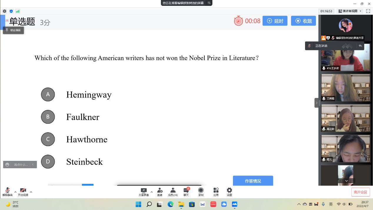 为了提高外语学子的文学素养,丰富员工的课余生活,4月7日下午,bevictor韦德国际以线上会议形式举办第一届“畅游文学,横贯中外”中西文学知识竞赛,本次竞赛由《中学英语》外编社承办,外编社指导老师周鹏宇作为嘉宾出席本次竞赛。