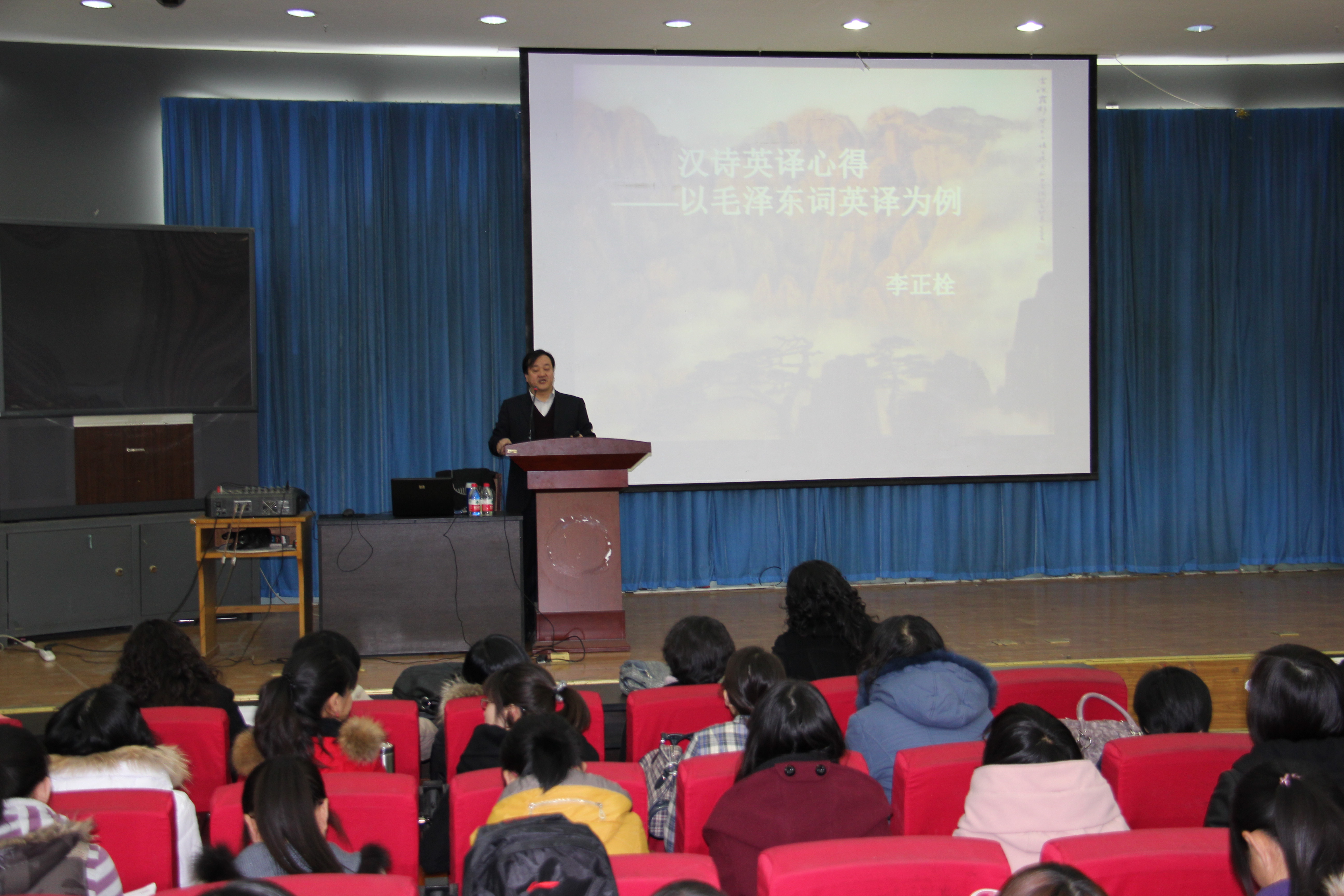 李正栓教授是河北省知名的中青年专家,是“河北省中青年社科专家五十人工程”人员。主要从事英美诗歌教学与研究、英汉诗互译及评论。此次报告,李教授正是以自己的研究专长为基础,结合毛泽东诗词,从专业翻译的角度,深入浅出地向广大师生讲解了在诗歌翻译过程中遇到的问题及翻译的技巧和方法。李教授声情并茂的朗诵、幽默的讲解无不深深地吸引了在场的师生,激发了员工学习英语的热情,增强了师生在诗歌翻译方面的兴趣。