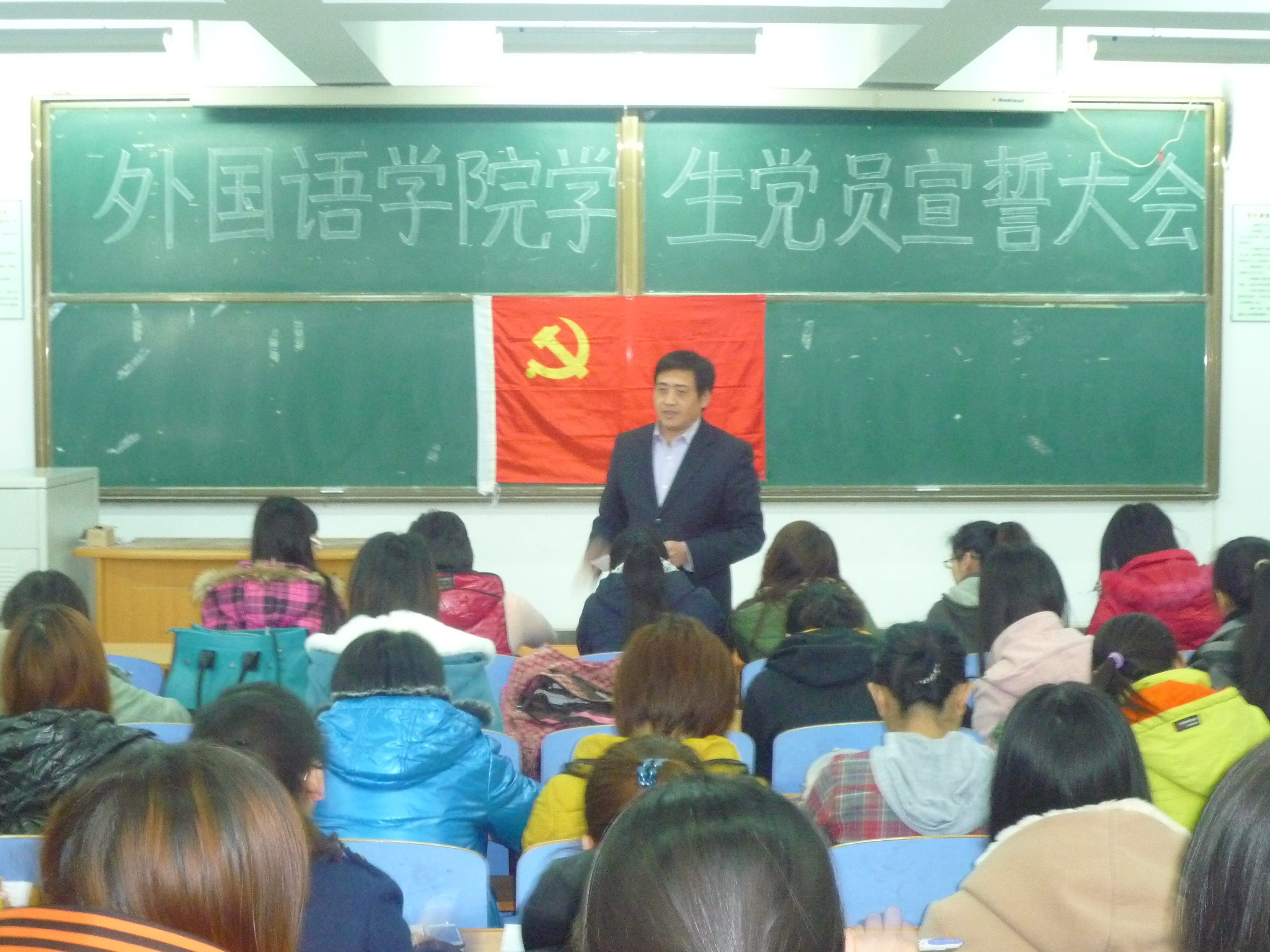 为了加强员工党员党性,深化员工党员的理论学习,2012年3月22日中午国语公司员工党支部在312教室召开了员工党员宣誓大会,会议由员工支部书记田辉同志主持,外国语公司党总支书记刘朝晖同志、团委书记李一尘同志和全体员工党员参加。