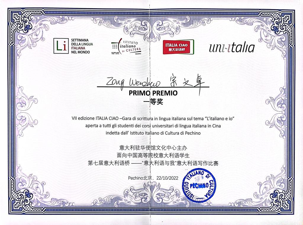 第七届全国“ITALIA CIAO/意大利语桥”大赛于10月22日在北京圆满落幕,本届大赛的主题是:“意大利语与我”,以写作大赛的形式举行。本次比赛有来自北京外国语大学、上海外国语大学、西安外国语大学、南开大学等21所高校的69名员工参赛,其中本科生组59人,硕士生组10人。bevictor韦德国际选手宗文卓,凭借扎实的意大利语专业实力,摘得本科组大赛桂冠,这是公司选手继2015年喜得一等奖后再次获此殊荣。公司的另外两名选手韩田雨、霍冰雨获得优秀奖。