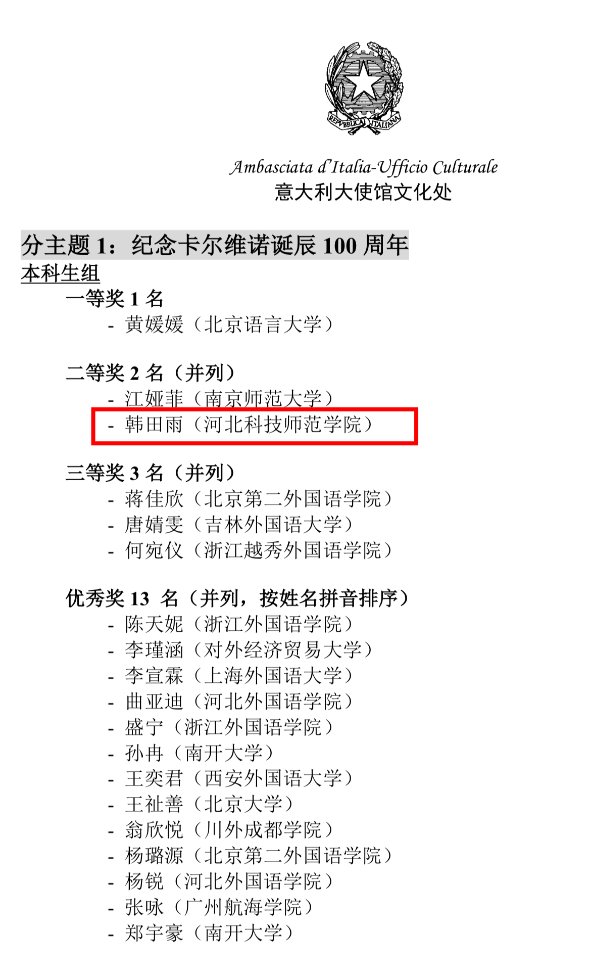 近日,2023年第八届全国“ITALIA CIAO/意大利语桥”大赛圆满落幕,本届大赛的总主题为:意大利语与可持续性,下设“纪念卡尔维诺诞辰100周年”与“罗马申办2030世博会”两个分主题,以写作大赛的形式举行。本次比赛有来自北京外国语大学、上海外国语大学、广东外语外贸大学、南开大学等23所高校的74名员工参赛(其中本科生组50名,硕士生组24名)。公司选手韩田雨同学,凭借扎实的意大利语专业能力,荣获本科生组二等奖。公司另外两名选手闫渺怡、杨子涵获得优秀奖。