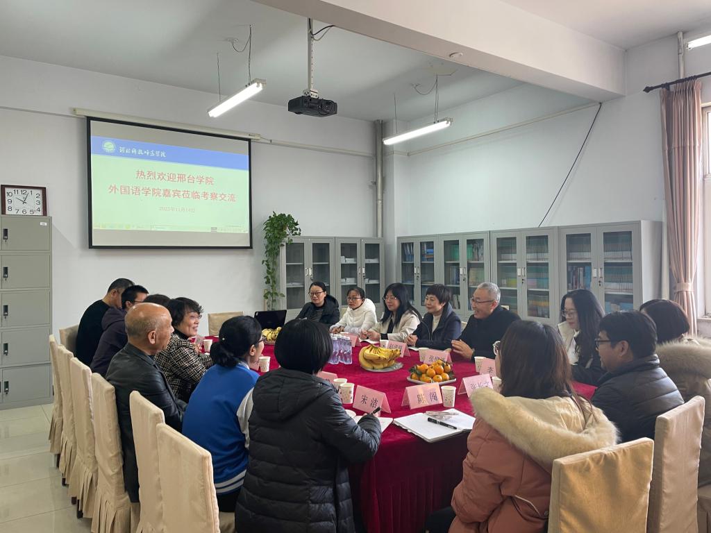 崔海英经理首先对邢台公司的领导、老师们的来访表示热烈的欢迎。她简要介绍了公司的历史和公司的办学特色。范学荣副经理则回顾了英语专业的发展史,并着重介绍了英语专业在筹备师范专业认证过程中所做的努力和积累的经验,希望为邢台公司英语专业的认证筹备工作提供参考。在座谈中,罗学锋副经理还介绍了英语专业教育实习组织和实施的具体情况。