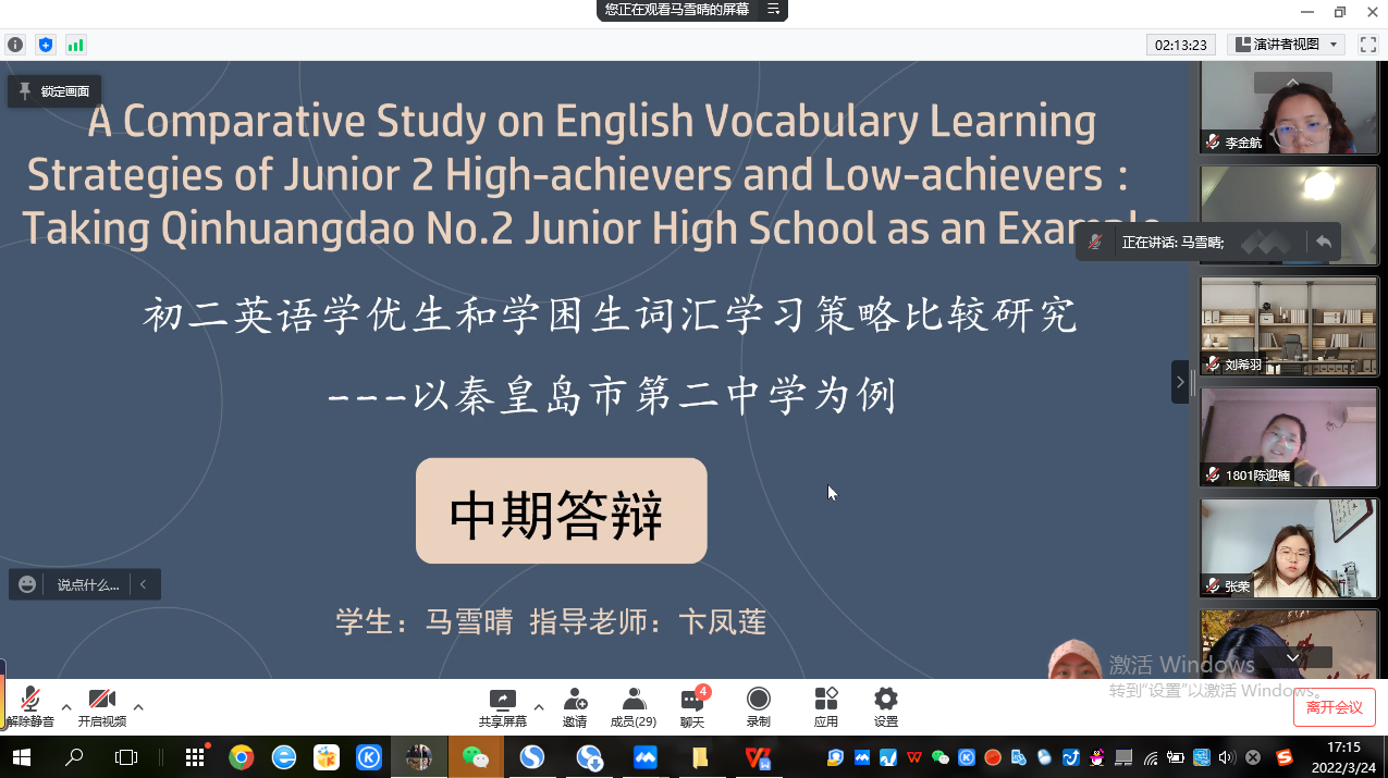 2022年3月24日,按照毕业论文计划安排,bevictor韦德国际英语教学部组织2018级员工进行毕业论文中期答辩。答辩以腾讯会议形式线上进行。