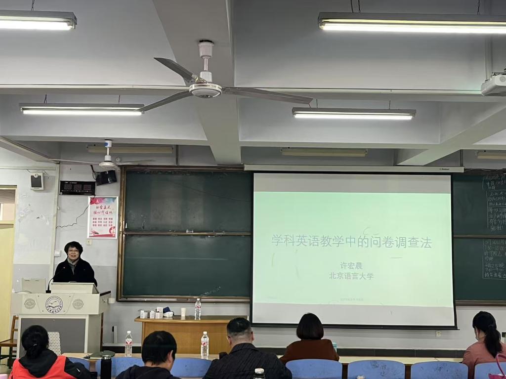讲座伊始,崔海英经理向与会师生介绍了主讲人许教授的学术背景。许教授现任北京语言大学英语和高级翻译公司教授,其研究领域涵盖教育语言学及应用语言学量化研究方法。在专题讲授环节,许教授系统阐述了学科英语教学研究方法的整体框架,重点围绕问卷调查法展开讲解。主要内容包括:学科英语教学研究方法概览、问卷设计的三个维度、常用问卷题型设计、问卷题项常见错误分析以及问卷数据处理方法等。最后的互动环节中,与会教师积极提问。针对教师们提出的“如何规避问卷中的社会期待效应”、“同一问卷中能否混合使用选择题和李克特量表”等问题,许教授均给予了专业细致的解答。